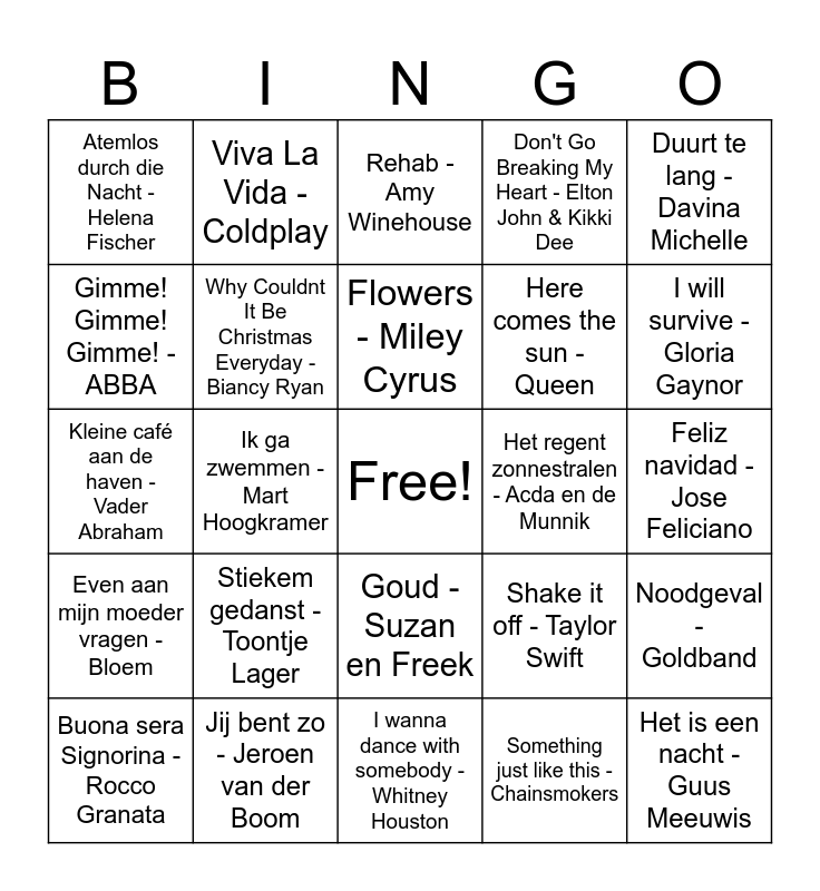 This bingo card has a free space and 50 words: Jolene - Dolly Parton, Het is een nacht - Guus Meeuwis, Sinds 1 dag of 2 - Doe Maar, I wanna dance with somebody - Whitney Houston, Stiekem gedanst - Toontje Lager, Bohemian Rhapsody - Queen, Viva La Vida - Coldplay, Under Pressure - David Bowie, Gimme! Gimme! Gimme! - ABBA, Door de wind - Miss Montreal, Why Couldnt It Be Christmas Everyday - Biancy Ryan, Don't Go Breaking My Heart - Elton John & Kikki Dee, Noodgeval - Goldband, Shake it off - Taylor Swift, Reünie - Snelle, Bad guy - Billie Eilish, Flowers - Miley Cyrus, Het regent zonnestralen - Acda en de Munnik, Ladada - Claude, Duurt te lang - Davina Michelle, Ik ga zwemmen - Mart Hoogkramer, Something just like this - Chainsmokers, Atemlos durch die Nacht - Helena Fischer, Here comes the sun - Queen, Lonely this Christmas - Mud, Driving home for Christmas - Chris Rea, I will survive - Gloria Gaynor, Rollin’ in the deep - Adele, Rehab - Amy Winehouse, Goud - Suzan en Freek, Zoutelande - Bløf & Geike, Vanavond (uit m’n bol) - Kriss Kross Amsterdam & Donnie, Als de morgen is gekomen - Jan Smit, Ik wou dat ik jou was - Veldhuis & Kemper, Jij bent zo - Jeroen van der Boom, Sexy als ik dans - Nielson, Father & Friend - Alain & Dane Clark, One Dance - Drake, Shape of you - Ed Sheeran, Feliz navidad - Jose Feliciano, Cantique de noel - Andrea Bocelli, Rollercoaster - Danny Vera, By the rivers of Babylon - Boney M., Happy Xmas (War is over) - John Lennon, Buona sera Signorina - Rocco Granata, Kleine café aan de haven - Vader Abraham, Bloed zweet en tranen - André Hazes, Mooi was die tijd - Corrie Konings, Even aan mijn moeder vragen - Bloem and Peter De Koning - Het Is Altijd Lente.