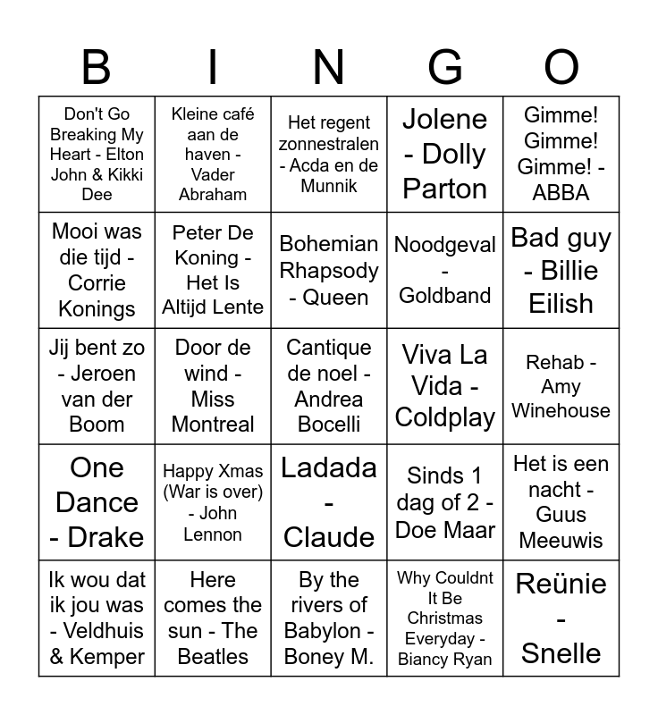 This bingo card has 50 words: Feliz navidad - Jose Feliciano, Cantique de noel - Andrea Bocelli, Rollercoaster - Danny Vera, By the rivers of Babylon - Boney M., Happy Xmas (War is over) - John Lennon, Buona sera Signorina - Rocco Granata, Kleine café aan de haven - Vader Abraham, Bloed zweet en tranen - André Hazes, Mooi was die tijd - Corrie Konings, Even aan mijn moeder vragen - Bloem, Peter De Koning - Het Is Altijd Lente, Jolene - Dolly Parton, Het is een nacht - Guus Meeuwis, Sinds 1 dag of 2 - Doe Maar, I wanna dance with somebody - Whitney Houston, Stiekem gedanst - Toontje Lager, Bohemian Rhapsody - Queen, Viva La Vida - Coldplay, Under Pressure - David Bowie, Gimme! Gimme! Gimme! - ABBA, Door de wind - Miss Montreal, Why Couldnt It Be Christmas Everyday - Biancy Ryan, Don't Go Breaking My Heart - Elton John & Kikki Dee, Noodgeval - Goldband, Shake it off - Taylor Swift, Reünie - Snelle, Bad guy - Billie Eilish, Flowers - Miley Cyrus, Het regent zonnestralen - Acda en de Munnik, Ladada - Claude, Duurt te lang - Davina Michelle, Ik ga zwemmen - Mart Hoogkramer, Something just like this - Chainsmokers, Atemlos durch die Nacht - Helena Fischer, Here comes the sun - The Beatles, Lonely this Christmas - Mud, Driving home for Christmas - Chris Rea, I will survive - Gloria Gaynor, Rollin’ in the deep - Adele, Rehab - Amy Winehouse, Goud - Suzan en Freek, Zoutelande - Bløf & Geike, Vanavond (uit m’n bol) - Kriss Kross Amsterdam & Donnie, Als de morgen is gekomen - Jan Smit, Ik wou dat ik jou was - Veldhuis & Kemper, Jij bent zo - Jeroen van der Boom, Sexy als ik dans - Nielson, Father & Friend - Alain & Dane Clark, One Dance - Drake and Shape of you - Ed Sheeran.