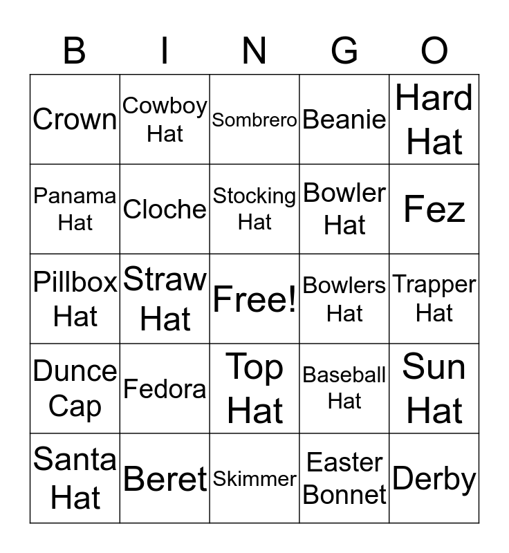This bingo card has a free space and 24 words: Fedora, Beret, Stocking Hat, Santa Hat, Hard Hat, Crown, Panama Hat, Cowboy Hat, Bowlers Hat, Top Hat, Bowler Hat, Pillbox Hat, Baseball Hat, Sun Hat, Cloche, Easter Bonnet, Trapper Hat, Sombrero, Fez, Straw Hat, Derby, Dunce Cap, Beanie and Skimmer.
