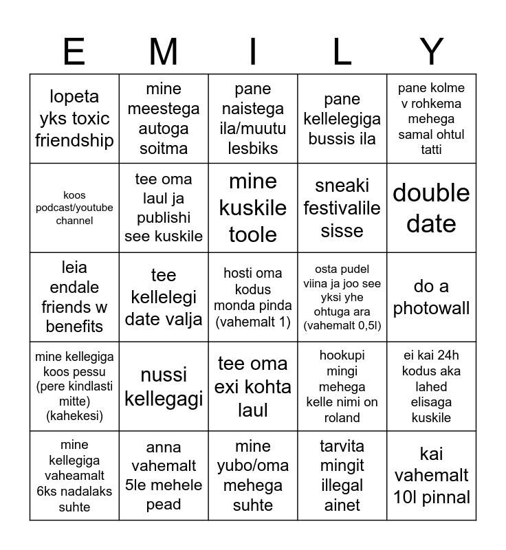 This bingo card has 25 words: nussi kellegagi, mine yubo/oma mehega suhte, mine kuskile toole, mine kellegiga vaheamalt 6ks nadalaks suhte, pane kolme v rohkema mehega samal ohtul tatti, lopeta yks toxic friendship, koos podcast/youtube channel, mine meestega autoga soitma, osta pudel viina ja joo see yksi yhe ohtuga ara (vahemalt 0,5l), tee oma exi kohta laul, sneaki festivalile sisse, leia endale friends w benefits, hookupi mingi mehega kelle nimi on roland, ei kai 24h kodus aka lahed elisaga kuskile, tee oma laul ja publishi see kuskile, kai vahemalt 10l pinnal, do a photowall, pane naistega ila/muutu lesbiks, double date, tee kellelegi date valja, hosti oma kodus monda pinda (vahemalt 1), anna vahemalt 5le mehele pead, mine kellegiga koos pessu (pere kindlasti mitte)(kahekesi), pane kellelegiga bussis ila and tarvita mingit illegal ainet.