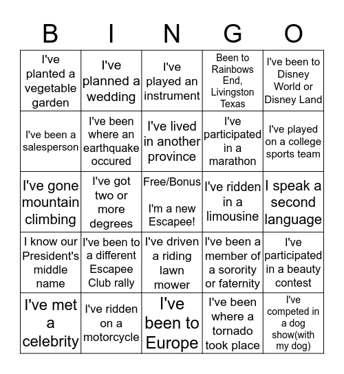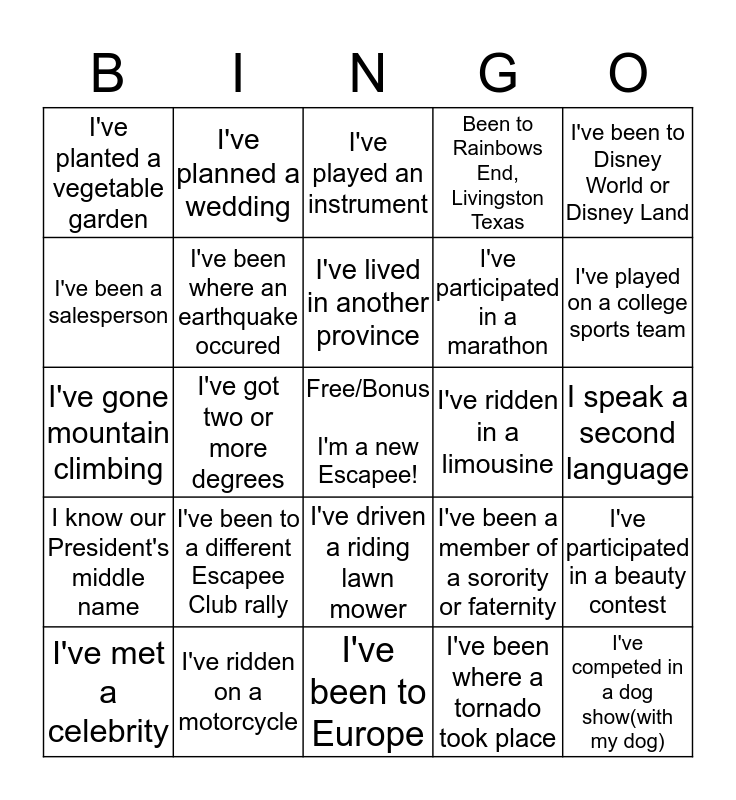 This bingo card has a free space and 24 words: I've been to a different Escapee Club rally, I've ridden on a motorcycle, I've lived in another province, I've met a celebrity, I've been to Disney World or Disney Land, I've planted a vegetable garden, I've been a salesperson, I've planned a wedding, I've ridden in a limousine, I've driven a riding lawn mower, I've participated in a marathon, I've gone mountain climbing, I've been a member of a sorority or faternity, I've participated in a beauty contest, I've been where an earthquake occured, I've been where a tornado took place, I speak a second language, I've played an instrument, I've played on a college sports team, I've got two or more degrees, I've competed in a dog show(with my dog), I know our President's middle name, Been to Rainbows End, Livingston Texas and I've been to Europe.