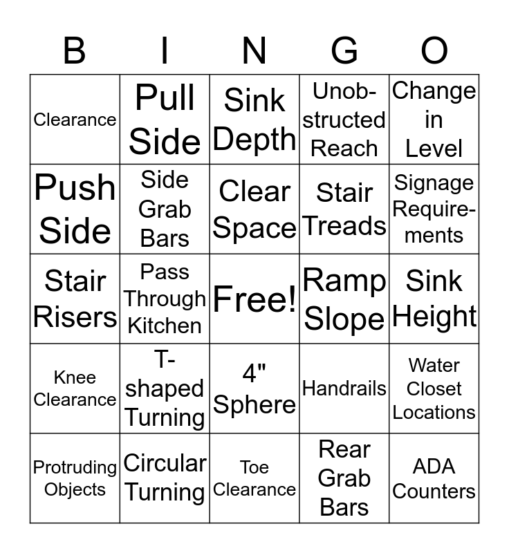 This bingo card has a free space and 24 words: T-shaped Turning, Circular Turning, Clear Space, Protruding Objects, Change in Level, Clearance, Push Side, Pull Side, Ramp Slope, 4" Sphere, Stair Treads, Stair Risers, Handrails, Water Closet Locations, Side Grab Bars, Rear Grab Bars, Sink Height, Sink Depth, Signage Require- ments, Pass Through Kitchen, ADA Counters, Knee Clearance, Unob- structed Reach and Toe Clearance.
