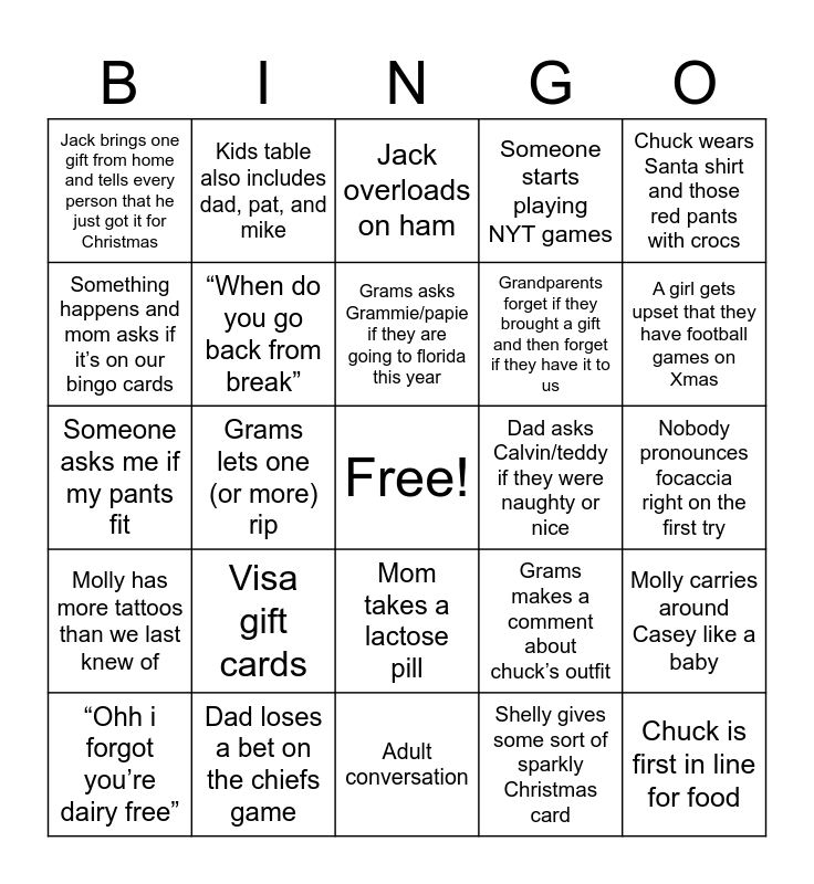 This bingo card has a free space and 24 words: Visa gift cards, Dad loses a bet on the chiefs game, Grams asks Grammie/papie if they are going to florida this year, “Ohh i forgot you’re dairy free”, Chuck wears Santa shirt and those red pants with crocs, Jack brings one gift from home and tells every person that he just got it for Christmas, Something happens and mom asks if it’s on our bingo cards, Kids table also includes dad, pat, and mike, Dad asks Calvin/teddy if they were naughty or nice, Mom takes a lactose pill, Grandparents forget if they brought a gift and then forget if they have it to us, Someone asks me if my pants fit, Grams makes a comment about chuck’s outfit, Molly carries around Casey like a baby, “When do you go back from break”, Shelly gives some sort of sparkly Christmas card, Nobody pronounces focaccia right on the first try, Jack overloads on ham, A girl gets upset that they have football games on Xmas, Grams lets one (or more) rip, Chuck is first in line for food, Molly has more tattoos than we last knew of, Someone starts playing NYT games and Adult conversation.