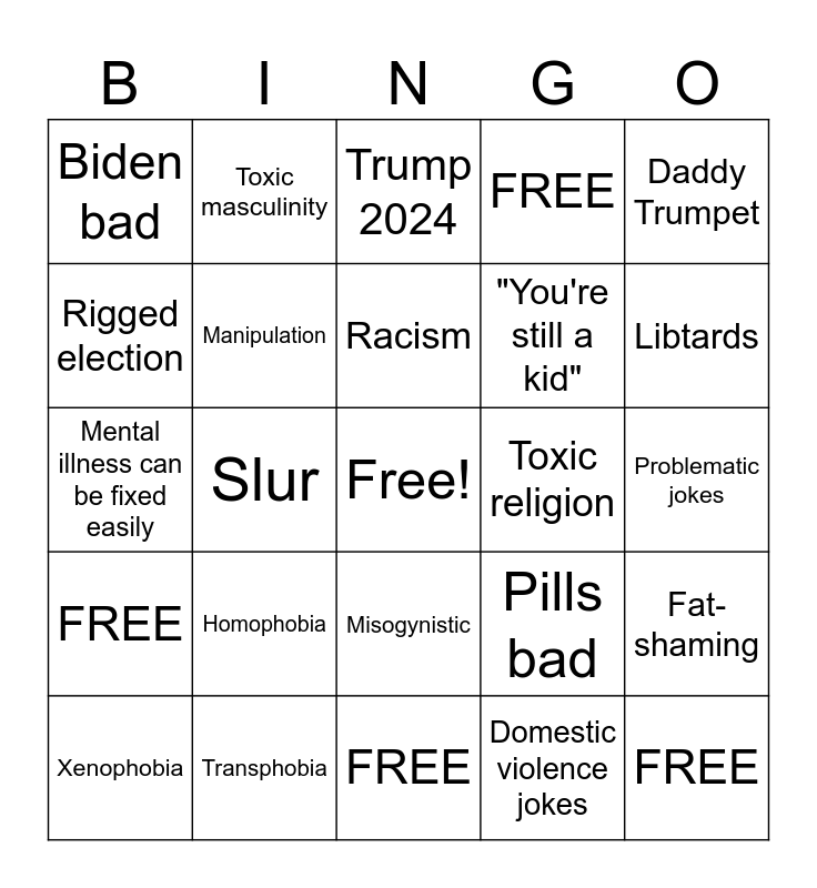 This bingo card has a free space and 24 words: Homophobia, Transphobia, Racism, Xenophobia, Daddy Trumpet, Biden bad, Rigged election, Toxic masculinity, Toxic religion, Misogynistic, "You're still a kid", Mental illness can be fixed easily, Pills bad, Fat-shaming, Manipulation, Domestic violence jokes, Problematic jokes, Trump 2024, Libtards, Slur, FREE, FREE, FREE and FREE.