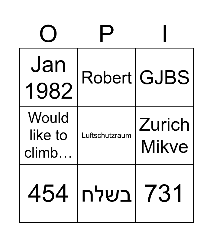 This bingo card has 19 words: 1954, Rue Crespin 10, GJBS, Yeshiva in Israel, ETH, Luftschutzraum, 2006, Jan 1982, Robert, 731, Böniger, Zurich Mikve, 454, B+, Built this in Algeria, England, Would like to climb…, בשלח and Childhood dream.