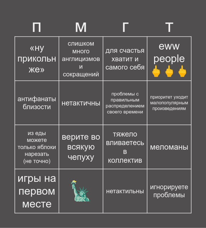 This bingo card has 16 words: 🗽, меломаны, для счастья хватит и самого себя, «ну прикольн же», из еды можете только яблоки нарезать (не точно), слишком много англицизмов и сокращений, тяжело вливаетесь в коллектив, нетактильны, антифанаты близости, нетактичны, игры на первом месте, eww people 🖕🖕🖕, верите во всякую чепуху, приоритет уходит малопопулярным произведениям, проблемы с правильным распределением своего времени and игнорируете проблемы.