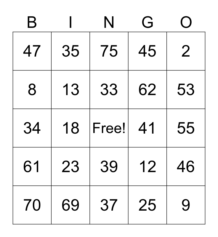 This bingo card has a free space and 24 words: 23, 69, 33, 70, 2, 47, 8, 35, 41, 39, 62, 34, 12, 46, 13, 25, 55, 75, 53, 18, 9, 61, 45 and 37.