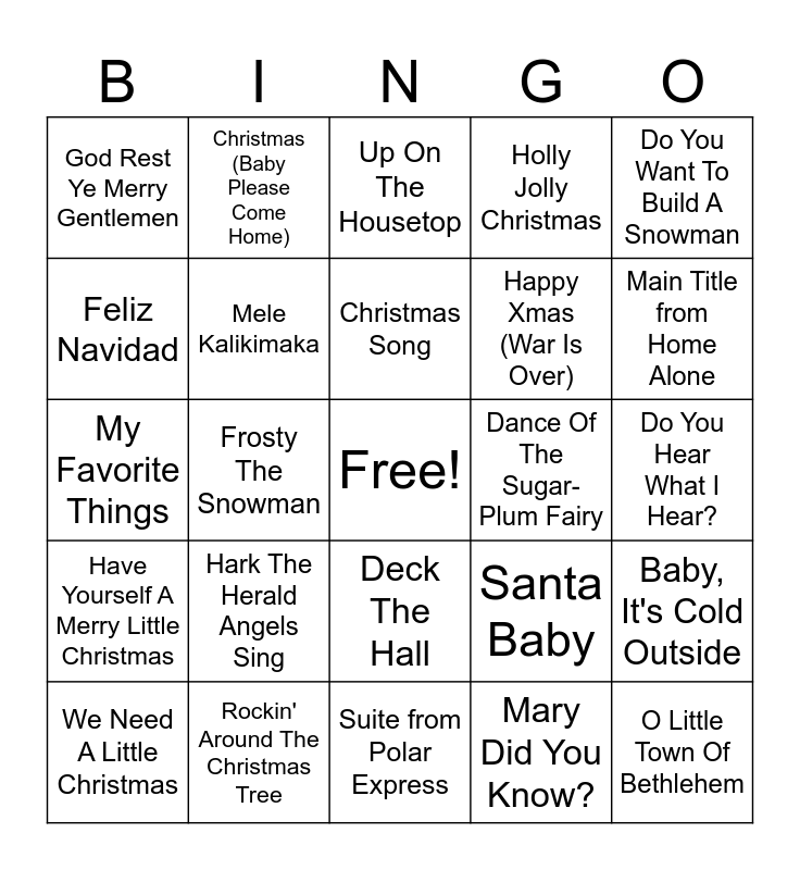 This bingo card has a free space and 64 words: 12 Days Of Christmas, All I Want For Christmas Is My Two Front Teeth, All I Want For Christmas Is You, Baby, It's Cold Outside, Carol Of The Bells, Chipmunk Song (Christmas Don't Be Late), Christmas (Baby Please Come Home), Christmas Canon, Christmas Song, Christmas Time Is Here, Deck The Hall, Ding Dong Merrily On High, Do You Hear What I Hear?, Do You Want To Build A Snowman, (Everybody's Waitin' For) The Man With The Bag, Feliz Navidad, Frosty The Snowman, God Rest Ye Merry Gentlemen, Grandma Got Run Over By A Reindeer, Happy Xmas (War Is Over), Hark The Herald Angels Sing, Have Yourself A Merry Little Christmas, Holly Jolly Christmas, I Saw Three Ships, It's Beginning To Look Like Christmas, It's The Most Wondeful Time Of The Year, I Want a Hippopotomus for Christmas, Jingle Bell Rock, Jingle Bells, Joy To The World, Last Christmas, Let It Snow! Let It Snow! Let It Snow!, Little Drummer Boy, Main Title from Elf, Main Title from Home Alone, We Need A Little Christmas, Marshmallow World, Mary Did You Know?, Mary's Boy Child, Mele Kalikimaka, My Favorite Things, Dance Of The Sugar-Plum Fairy, O Come, All Ye Faithful, O Come, O Come, Emmanuel, O Holy Night, O Little Town Of Bethlehem, Rockin' Around The Christmas Tree, Run Rudolph Run, Santa Baby, Santa Tell Me, Skating, Sleigh Ride, Suite from Polar Express, (There's No Place Like) Home For The Holidays, This Christmas, Underneath The Tree, Up On The Housetop, We Three Kings, Where Are You Christmas?, White Christmas, White Winter Hymnal, Winter Wonderland, Wonderful Christmastime and You're A Mean One, Mr. Grinch.