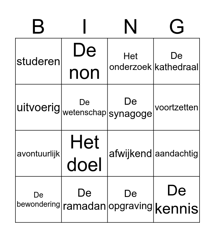 This bingo card has a free space and 15 words: De bewondering, De kennis, Het onderzoek, studeren, voortzetten, uitvoerig, Het doel, De opgraving, De wetenschap, avontuurlijk, aandachtig, De kathedraal, De synagoge, De non and De ramadan.
