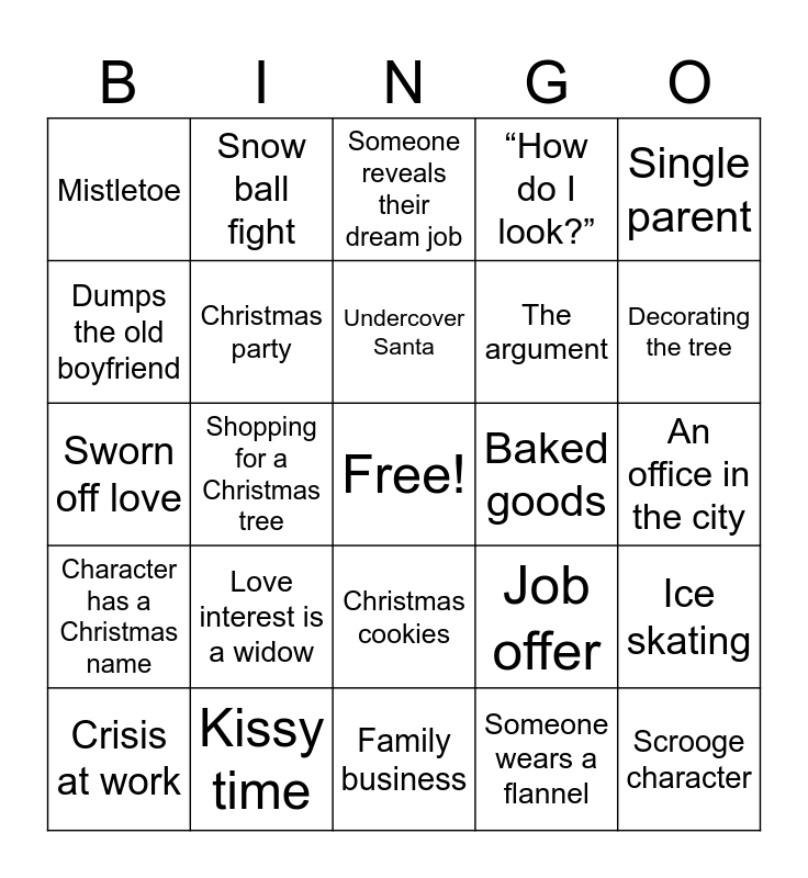 This bingo card has a free space and 29 words: Crisis at work, Big city boyfriend, Shopping for a Christmas tree, Talking about someone who is dead, Mistletoe, Someone reveals their dream job, Christmas party, Love interest is a widow, Baked goods, Kissy time, An office in the city, Scrooge character, Family business, Someone wears a flannel, Decorating the tree, Eggnog, Christmas cookies, Character has a Christmas name, Single parent, Sworn off love, Job offer, Cheesy music montage, The argument, Dumps the old boyfriend, “How do I look?”, Snow ball fight, Ice skating, Undercover Santa and Perfect child.