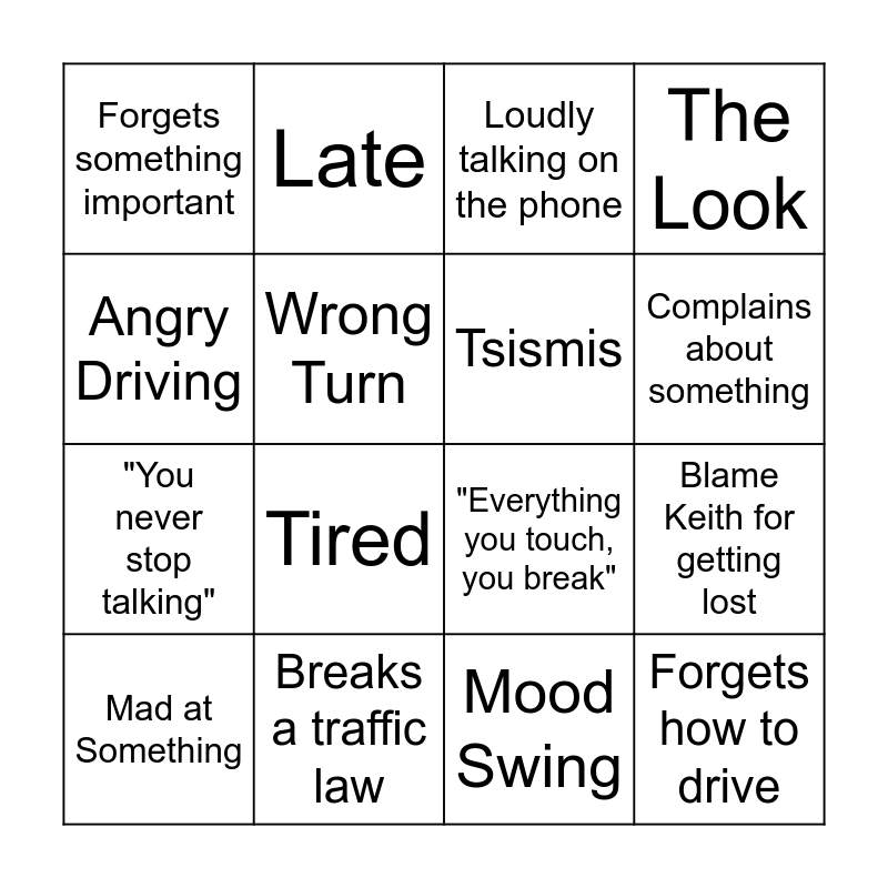 This bingo card has 16 words: Breaks a traffic law, Blame Keith for getting lost, Loudly talking on the phone, Forgets something important, "You never stop talking", Late, "Everything you touch, you break", Mood Swing, Angry Driving, Wrong Turn, Mad at Something, The Look, Tired, Complains about something, Tsismis and Forgets how to drive.