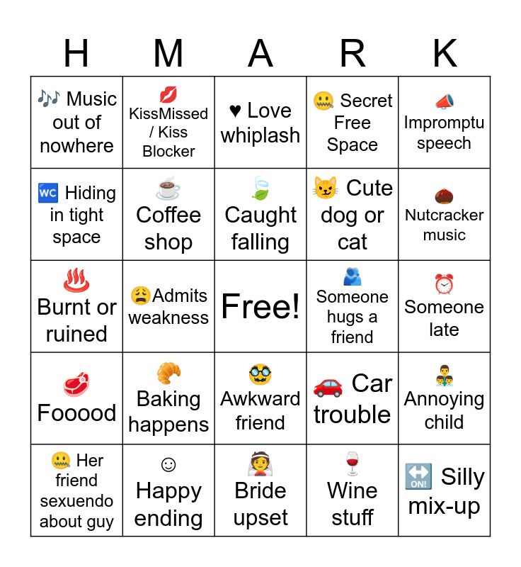 This bingo card has a free space and 24 words: ๐ฅ Baking happens, โบ๏ธ Happy ending, ๐Caught falling, ๐ค Her friend sexuendo about guy, ๐ฃ Impromptu speech, ๐ถ Music out of nowhere, ๐พ Hiding in tight space, ๐ KissMissed / Kiss Blocker, ๐ซ Someone hugs a friend, ๐ฅธ Awkward friend, ๐ผ Cute dog or cat, โจ๏ธ Burnt or ruined, ๐ Car trouble, ๐จโ๐ฆโ๐ฆ Annoying child, โ Coffee shop, ๐ท Wine stuff, โฐ Someone late, โฅ๏ธ Love whiplash, ๐ฐ Nutcracker music, ๐ฉAdmits weakness, ๐ Silly mix-up, ๐ฅฉ Fooood, ๐ค Secret Free Space and ๐ฐ Bride upset.