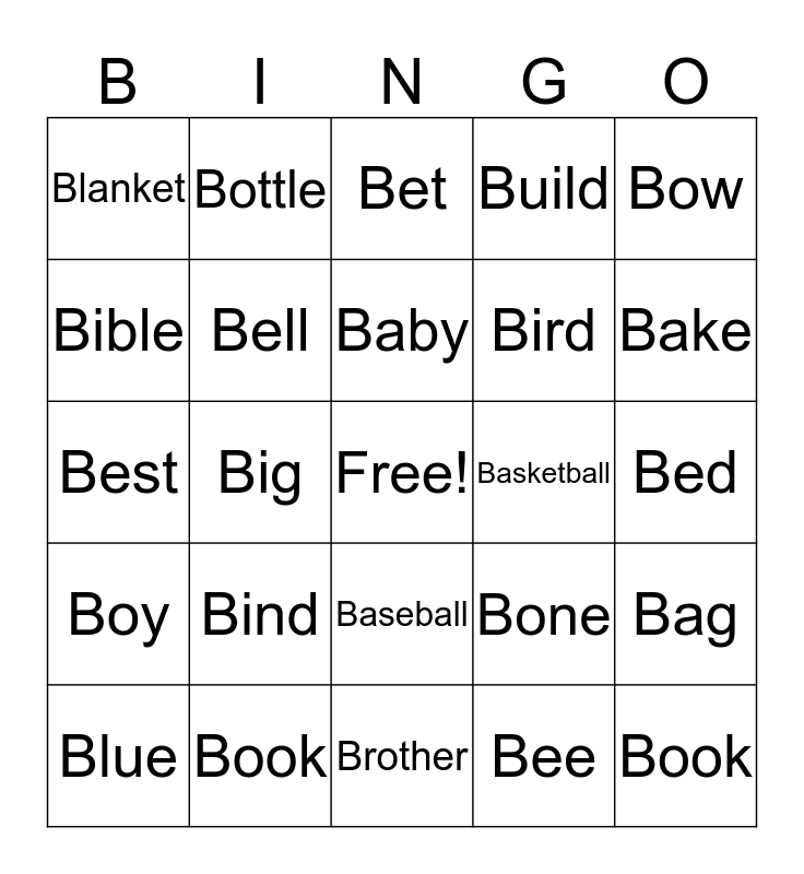 This bingo card has a free space and 24 words: Bind, Book, Baby, Blue, Bow, Blanket, Bible, Bottle, Basketball, Baseball, Bird, Best, Bone, Bag, Bell, Bee, Bed, Bet, Bake, Big, Book, Boy, Build and Brother.