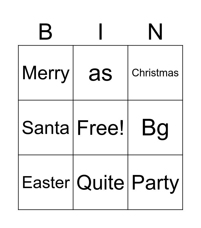 This bingo card has a free space and 12 words: Enter, cards, Party, Bg, as, Christmas, Quite, If, Merry, Santa, Easter and Apple.