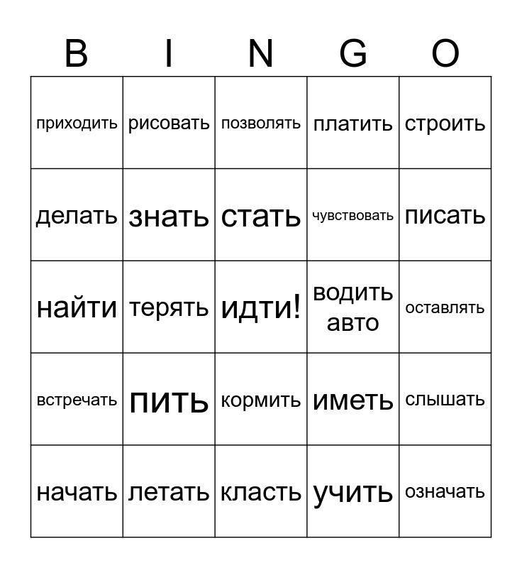 This bingo card has a free space and 24 words: пить, летать, стать, начать, строить, приходить, делать, рисовать, водить авто, кормить, чувствовать, найти, иметь, слышать, знать, учить, оставлять, позволять, писать, терять, означать, встречать, платить and класть.