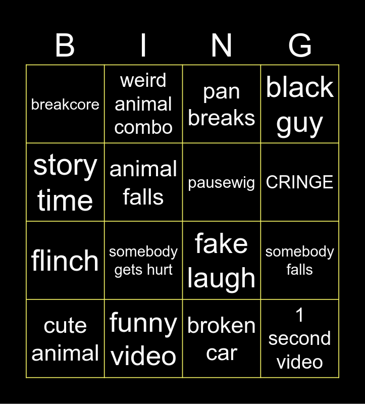 This bingo card has 20 words: somebody falls, padding for time, pan breaks, tik tok song, cute animal, story time, funny video, breakcore, flinch, weird animal combo, somebody gets hurt, fake laugh, animal falls, 1 second video, pausewig, broken car, CRINGE, black guy, broken car and among us.