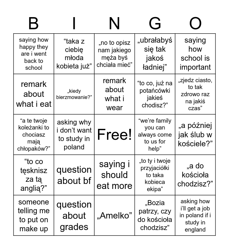 This bingo card has a free space and 24 words: question about bf, question about grades, remark about what i wear, someone telling me to put on make up, saying how school is important, saying how happy they are i went back to school, remark about what i eat, “taka z ciebię młoda kobieta już”, “we’re family you can always come to us for help”, saying i should eat more, “to co, już na potańcówki jakieś chodisz?”, “a te twoje koleżanki to chociasz mają chłopaków?”, „to ty i twoje przyjaciółki to taka kobieca ekipa”, „a do kościoła chodzisz?”, „kiedy bierzmowanie?”, „Bozia patrzy, czy do kościoła chodzisz”, „a później jak ślub w kościele?”, „no to opisz nam jakiego męża byś chciała mieć”, „zjedz ciasto, to tak zdrowo raz na jakiś czas”, asking why i don’t want to study in poland, asking how i’ll get a job in poland if i study in england, “to co tęsknisz za tą anglią?”, „ubrałabyś się tak jakoś ładniej” and „Amelko”.