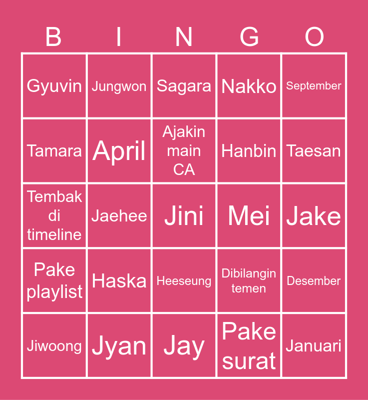 This bingo card has a free space and 24 words: Haska, Jyan, Ajakin main CA, Jiwoong, September, Gyuvin, Tamara, Jungwon, Mei, Heeseung, Hanbin, Tembak di timeline, Dibilangin temen, Desember, April, Pake surat, Jake, Sagara, Taesan, Jaehee, Januari, Pake playlist, Nakko and Jay.