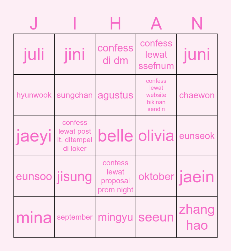 This bingo card has a free space and 24 words: mina, jisung, agustus, seeun, juni, juli, jini, confess di dm, olivia, eunseok, jaeyi, sungchan, oktober, jaein, hyunwook, september, mingyu, confess lewat ssefnum, chaewon, eunsoo, confess lewat post it. ditempel di loker, confess lewat proposal prom night, confess lewat website bikinan sendiri and zhang hao.