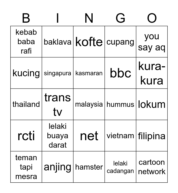 This bingo card has a free space and 24 words: teman tapi mesra, lelaki buaya darat, kasmaran, lelaki cadangan, you say aq, kebab baba rafi, baklava, kofte, hummus, lokum, thailand, singapura, vietnam, filipina, kucing, anjing, hamster, cupang, kura-kura, rcti, trans tv, net, bbc and cartoon network.
