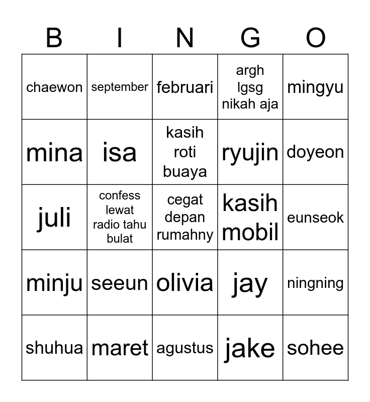 This bingo card has a free space and 24 words: seeun, maret, kasih roti buaya, shuhua, mingyu, chaewon, mina, september, kasih mobil, olivia, ryujin, juli, jay, ningning, isa, jake, eunseok, februari, doyeon, confess lewat radio tahu bulat, sohee, minju, argh lgsg nikah aja and agustus.