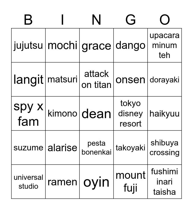 This bingo card has a free space and 24 words: alarise, ramen, attack on titan, universal studio, upacara minum teh, jujutsu, langit, mochi, tokyo disney resort, pesta bonenkai, onsen, spy x fam, takoyaki, shibuya crossing, matsuri, mount fuji, haikyuu, grace, dorayaki, kimono, fushimi inari taisha, suzume, dango and oyin.