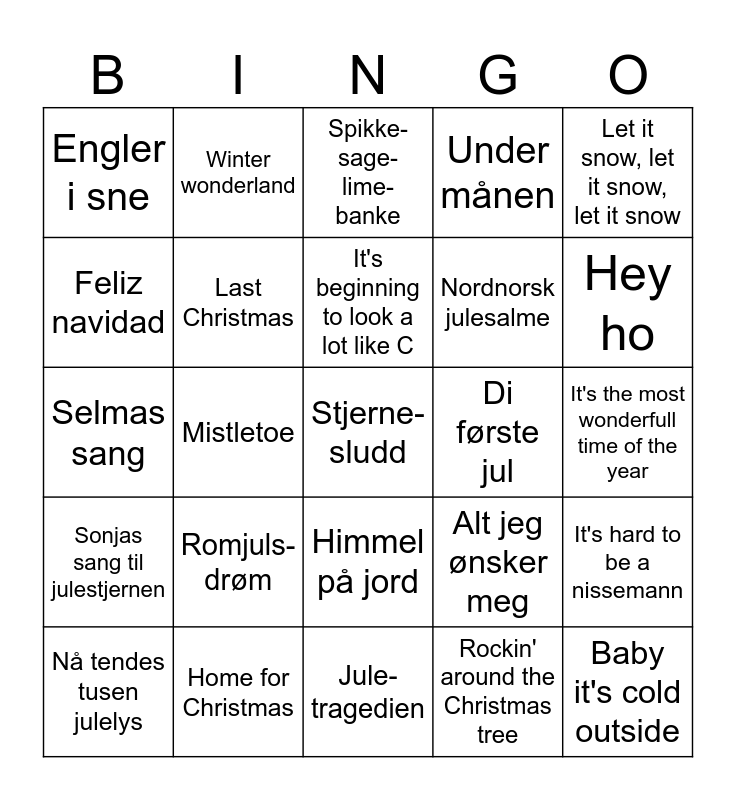 This bingo card has 40 words: Jul i svingen, Selmas sang, All i want for christmas is you, Last Christmas, Home for Christmas, Himmel på jord, It's beginning to look a lot like C, Driving home for Christmas, Let it snow, let it snow, let it snow, Sonjas sang til julestjernen, Mistletoe, Under månen, Stjerne-sludd, It's the most wonderfull time of the year, Di første jul, Romjuls-drøm, The Støvel Dance, Engler i sne, Happy Xmas (war is over), Spikke-sage-lime-banke, It's hard to be a nissemann, Rockin' around the Christmas tree, Nordnorsk julesalme, Feliz navidad, Himlen i min famn, When you wish upon a star, Musevisa, Det lyser i stille grender, Baby it's cold outside, Have yourself a merry little C, White Christmas, Nå tendes tusen julelys, O helga natt, Alt jeg ønsker meg, Hey ho, Jule-tragedien, Blue Christmas, Fairytale of New York, Winter wonderland and I saw mommy kissing santaC.