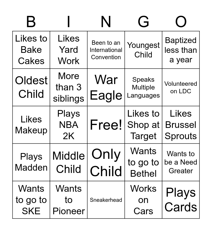 This bingo card has a free space and 35 words: Pioneers, Left Handed, Distinct Laugh, More than 3 siblings, Only Child, Youngest Child, Oldest Child, Roll Tide, War Eagle, Plays Basketball, Likes Makeup, Baptized less than a year, Baptized more than a year, Traveled Outside Home Country, Likes to Bake Cakes, Likes to Shop at Target, Works on Cars, Plays NBA 2K, Plays Madden, Plays Cards, Wants to go to Bethel, Wants to go to SKE, Wants to be a Need Greater, Wants to Pioneer, Been to an International Convention, Volunteered on LDC, Been to an NBA Game, Been to an NFL Game, Speaks Multiple Languages, Likes Brussel Sprouts, Has a Job, Sneakerhead, Middle Child, Likes Yard Work and Plays an Instrument.