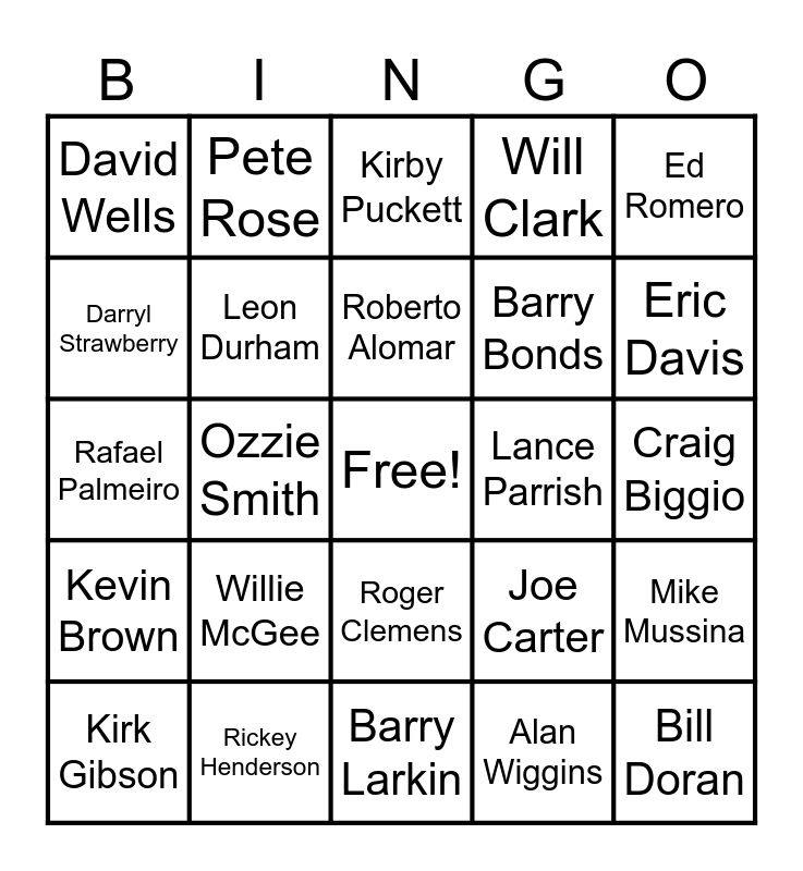 This bingo card has a free space and 90 words: Goose Gossage, Ken Griffey Jr., Roger Clemens, Greg Maddux, Pedro Martinez, Edgar Martinez, Randy Johnson, Tom Glavine, Mark McGwire, John Smoltz, Ivan Rodriguez, Frank Thomas, Jeff Bagwell, Craig Biggio, Sammy Sosa, Roberto Alomar, Cal Ripken, Mike Piazza, Bernie Williams, Catfish Hunter, Larry Walker, Jay Bell, Barry Larkin, Albert Belle, Rafael Palmeiro, Rickey Henderson, Curt Schilling, David Cone, Fred McGriff, Tony Gwynn, Kenny Lofton, Mike Mussina, Wade Boggs, Kevin Brown, David Wells, Will Clark, Kirby Puckett, Ryne Sandberg, Ozzie Smith, Eric Davis, Kirk Gibson, Darryl Strawberry, George Brett, Robin Yount, Paul Molitor, Joe Carter, Dale Murphy, Kevin Bass, Matt Williams, Claudel Washington, Jose Cruz, Barry Bonds, Van Slyke, Vince Coleman, Rob Deer, Shawon Dunston, Lance Parrish, Howard Johnson, Carlton Fisk, Benito Santiago, Carmelo Martinez, Ozzie Guillen, Lloyd Moseby, Cecil Cooper, Brett Butler, Robbie Thompson, Brooks Jacoby, Alan Wiggins, Keith Hernandez, Tommy Herr, Willie McGee, Bill Doran, Willie Wilson, Frank White, Pete Rose, Leon Durham, Eddie Murray, Mike Scosia, Dicke Thon, Kal Daniels, Tom Veryzer, Ed Romero, Andres Thomas, Gary Sutherland, Tommy Thevenow, Juan Castro, Tuck Stainback, Dan Meyer, Doug Flynn and Bill Bergen.