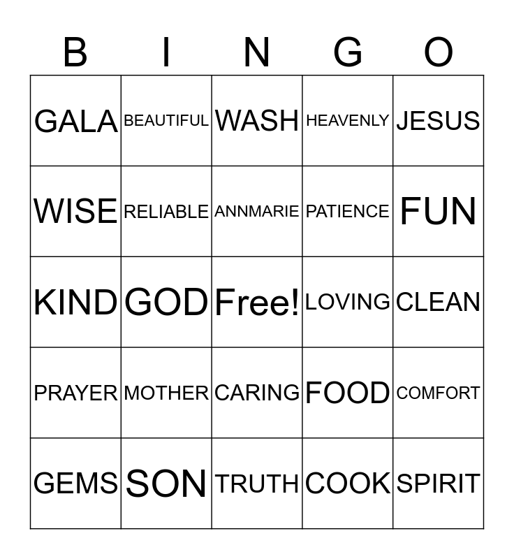 This bingo card has a free space and 24 words: MOTHER, SON, ANNMARIE, GEMS, JESUS, GALA, WISE, BEAUTIFUL, LOVING, CARING, PATIENCE, KIND, FOOD, COMFORT, RELIABLE, COOK, CLEAN, WASH, FUN, GOD, SPIRIT, PRAYER, HEAVENLY and TRUTH.
