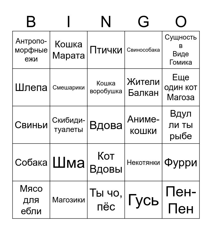 This bingo card has a free space and 24 words: Шма, Магозики, Кошка воробушка, Мясо для ебли, Сущность в Виде Гомика, Антропо-морфные ежи, Шлепа, Кошка Марата, Аниме-кошки, Кот Вдовы, Жители Балкан, Свиньи, Некотянки, Фурри, Смешарики, Гусь, Вдул ли ты рыбе, Птички, Еще один кот Магоза, Скибиди-туалеты, Пен-Пен, Собака, Свинособака and Ты чо, пёс.