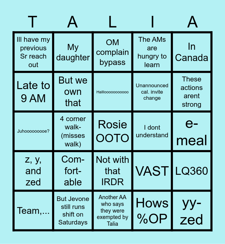 This bingo card has a free space and 24 words: Com-fort-able, But Jevone still runs shift on Saturdays, Halllooooooooooo, Team,..., In Canada, Ill have my previous Sr reach out, Late to 9 AM, My daughter, I dont understand, Not with that IRDR, Unannounced cal. invite change, Juhooooooooe?, VAST, LQ360, But we own that, Hows %OP, e-meal, OM complain bypass, These actions arent strong, 4 corner walk- (misses walk), yy-zed, z, y, and zed, The AMs are hungry to learn and Another AA who says they were exempted by Talia.