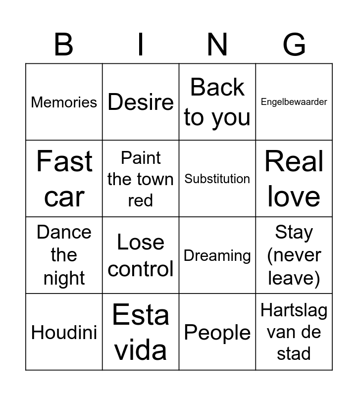 This bingo card has 25 words: Vas-y (ga maar), Unhealthy, Real love, Nickel for goodbye, Fast car, Memories, Paint the town red, Desire, Esta vida, Overcome, Dance the night, Dreaming, The feeling, Lil boo thang, Substitution, Runaway, People, Back to you, Lose control, Stay (never leave), Houdini, Hier mag alles, Hartslag van de stad, Engelbewaarder and Overdrive.