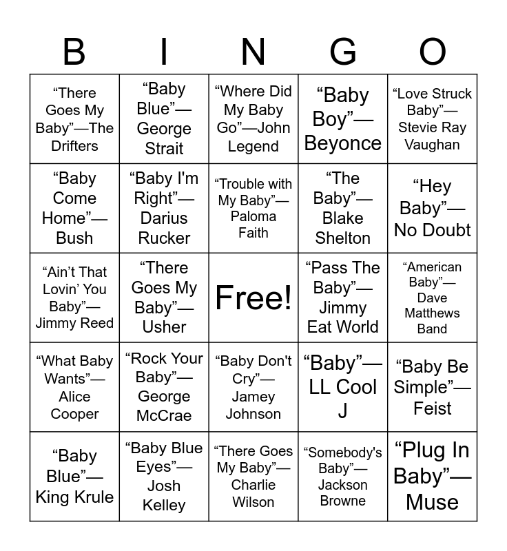 This bingo card has a free space and 78 words: “Baby”—Justin Bieber, “Baby, I Love Your Way”—Peter Frampton, “Where Did My Baby Go”—John Legend, “It’s All Over Now, Baby Blue”—Bob Dylan, “Baby Baby”—Amy Grant, “Baby's In Black”—The Beatles, “There Goes My Baby”—Enrique Iglesias, “Give It to Me Baby”—Rick James, “Runaway Baby”—Bruno Mars, “Baby By Me”—50 Cent, “Always Be My Baby”—Mariah Carey, “Baby Jump”—Mungo Jerry, “Baby Boy”—Beyonce, “There Goes My Baby”—The Drifters, “Don't Worry Baby”—The Beach Boys, “Baby Come Home”—Bush, “Take Care My Baby”—Matthew E. White, “Rock Your Baby”—George McCrae, “Find My Baby”—Moby, “American Baby”—Dave Matthews Band, “Doing It All For My Baby”—Huey Lewis & The News, “Love Struck Baby”—Stevie Ray Vaughan, “Ain’t That Lovin’ You Baby”—Jimmy Reed, “Trouble with My Baby”—Paloma Faith, “Baby I'm Right”—Darius Rucker, “Baby I”—Ariana Grande, “Baby I'm-A Want You”—Bread, “Nobody Puts Baby In The Corner”—Fall Out Boy, “Dream Baby Dream”—Bruce Springsteen, “Born to Be My Baby”—Bon Jovi, “Hey Baby”—No Doubt, “I Can't Quit You Baby”—Led Zeppelin, “There Goes My Baby”—Charlie Wilson, “Sugar Baby Love”—Rubettes, “Baby Blue”—King Krule, “Pass The Baby”—Jimmy Eat World, “Baby Come Home”—Scissor Sisters, “Someone Else Calling You Baby”—Luke Bryan, “Baby Come Back To Bed”—Rumer, “Plug In Baby”—Muse, “Baby Come On With It”—Natalie Stovall and the Drive, “I Need You Baby (Mona)”—The Rolling Stones, “Baby Boy”—Childish Gambino, “Cry Baby”—Melanie Martinez, “Hi-Roller Baby”—Joe Walsh, “Baby Blue”—George Strait, “Star Baby”—The Guess Who, “Tell Me Baby”—Red Hot Chili Peppers, “Baby Come Back”—Player, “Since I Lost My Baby”—The Temptations, “Baby Be Simple”—Feist, “There Goes My Baby”—Usher, “Baby”—LL Cool J, “Walkin' My Baby Back Home”—Nat King Cole, “Baby Hold On”—Dixie Chicks, “Ghetto Baby”—Cheryl, “Baby Don't Forget My Number”—Milli Vanilli, “I Want My Baby Back”—Jimmy Cross, “When She Says Baby”—Jason Aldean, “Baby Don't Cry”—Jamey Johnson, “The Baby”—Blake Shelton, “Baby Let Your Hair Grow Long”—Brian Wilson, “For Baby (For Bobbie)”—John Denver, “Baby Blue”—Badfinger, “I Had A Baby”—Sinead O'Connor, “Baby I Need Your Loving”—The Four Tops, “I'm Your Baby Tonight”—Whitney Houston, “Baby I Do”—Alison Moyet, “What Baby Wants”—Alice Cooper, “Baby Blue Eyes”—Josh Kelley, “Baby It's Cold Outside”—Margaret Whiting and Johnny Mercer, “Be My Baby”—Ariana Grande, “Ice Ice Baby”—Vanilla Ice, “Brooklyn Baby”—Lana Del Rey, “Somebody's Baby”—Jackson Browne, “Rock-A-Hula Baby”—Elvis Presley, “...Baby One More Time”—Britney Spears and "Baby Got Back”—Sir Mix-A-Lot.