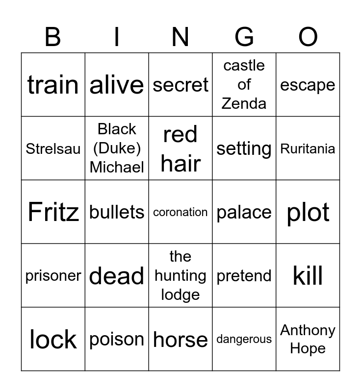 This bingo card has 35 words: Rudolf Rassendyll, Prince Rudolf, Princess Flavia, Black (Duke) Michael, the hunting lodge, castle of Zenda, Strelsau, Madame Antoinette, red hair, Sapt, Fritz, escape, revolver, moat, train, palace, dangerous, bullets, prisoner, coronation, pretend, lock, kill, poison, secret, Ruritania, Anthony Hope, novel, setting, plot, relatives, horse, dead, alive and bullets.