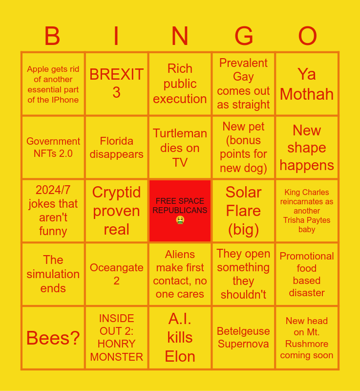This bingo card has a free space and 24 words: Oceangate 2, INSIDE OUT 2: HONRY MONSTER, Turtleman dies on TV, Bees?, Ya Mothah, Apple gets rid of another essential part of the IPhone, Government NFTs 2.0, BREXIT 3, Solar Flare (big), Aliens make first contact, no one cares, New pet (bonus points for new dog), 2024/7 jokes that aren't funny, They open something they shouldn't, Promotional food based disaster, Florida disappears, Betelgeuse Supernova, King Charles reincarnates as another Trisha Paytes baby, Rich public execution, New shape happens, Cryptid proven real, New head on Mt. Rushmore coming soon, The simulation ends, Prevalent Gay comes out as straight and A.I. kills Elon.