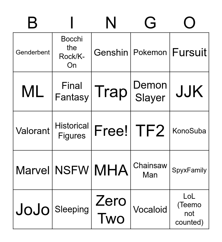 This bingo card has a free space and 24 words: NSFW, Sleeping, Trap, JoJo, Fursuit, Genderbent, ML, Bocchi the Rock/K-On, TF2, MHA, Demon Slayer, Valorant, Chainsaw Man, SpyxFamily, Final Fantasy, Vocaloid, KonoSuba, Genshin, JJK, Historical Figures, LoL (Teemo not counted), Marvel, Pokemon and Zero Two.