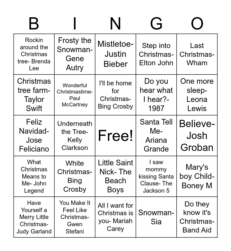 This bingo card has a free space and 25 words: White Christmas- Bing Crosby, All I want for Christmas is you- Mariah Carey, I'll be home for Christmas- Bing Crosby, Have Yourself a Merry Little Christmas- Judy Garland, Last Christmas- Wham, Rockin around the Christmas tree- Brenda Lee, Christmas tree farm- Taylor Swift, Frosty the Snowman- Gene Autry, Santa Tell Me- Ariana Grande, Little Saint Nick- The Beach Boys, Do you hear what I hear?- 1987, Feliz Navidad- Jose Feliciano, I saw mommy kissing Santa Clause- The Jackson 5, Mary's boy Child- Boney M, Wonderful Christmastime- Paul McCartney, 8 Days of Christmas - Destiny's Child, Believe- Josh Groban, Mistletoe- Justin Bieber, One more sleep- Leona Lewis, Underneath the Tree- Kelly Clarkson, Do they know it's Christmas- Band Aid, You Make It Feel Like Christmas- Gwen Stefani, What Christmas Means to Me- John Legend, Step into Christmas- Elton John and Snowman- Sia.