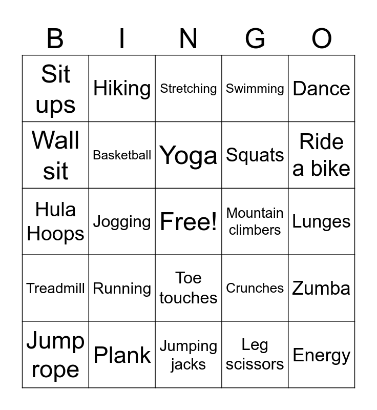 This bingo card has a free space and 24 words: Running, Plank, Yoga, Jump rope, Dance, Sit ups, Wall sit, Hiking, Mountain climbers, Toe touches, Squats, Hula Hoops, Crunches, Zumba, Basketball, Leg scissors, Lunges, Stretching, Ride a bike, Jogging, Energy, Treadmill, Swimming and Jumping jacks.