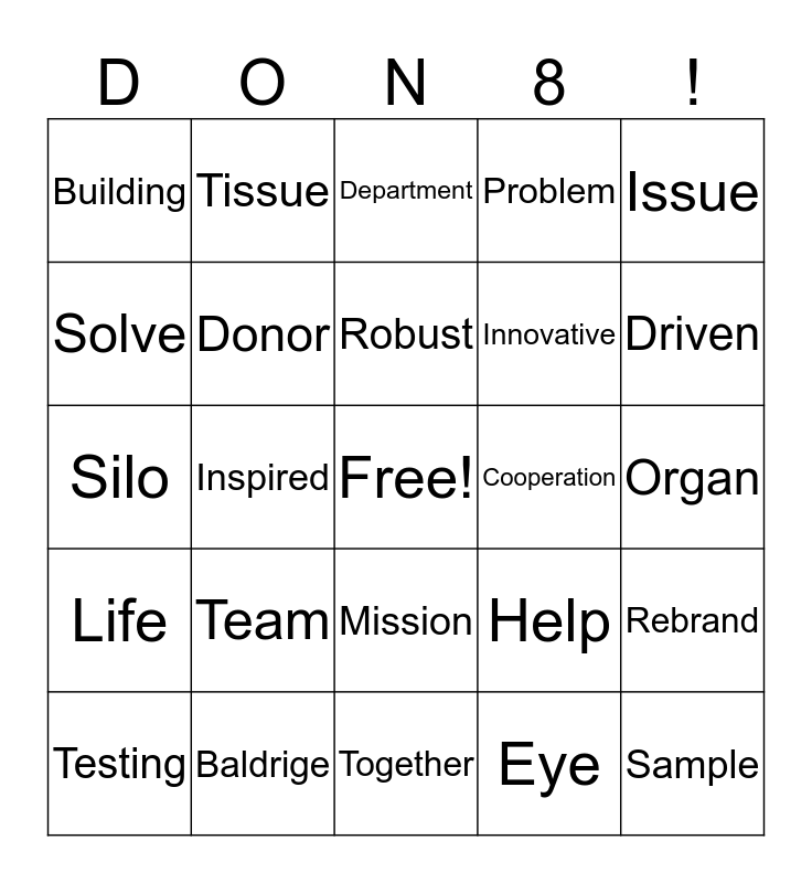 This bingo card has a free space and 24 words: Team, Baldrige, Robust, Testing, Issue, Building, Solve, Tissue, Cooperation, Mission, Innovative, Silo, Help, Rebrand, Donor, Eye, Organ, Department, Driven, Inspired, Sample, Life, Problem and Together.