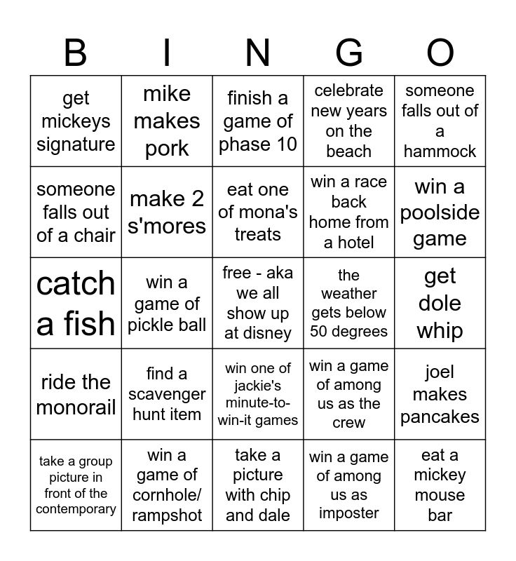This bingo card has a free space and 39 words: get a lei from the polynesian, take a selfie with a cast member at an outpost, hide a scavenger hunt item (someone has to find it), make 2 s'mores, take a group picture in front of the contemporary, win one of jackie's minute-to-win-it games, eat one of mona's treats, movie night, someone falls out of a hammock, ride the monorail, win a game of pickle ball, celebrate new years on the beach, eat a mickey mouse bar, get dole whip, the weather gets below 50 degrees, find a scavenger hunt item, see more than 5 olafs while looping, get mickeys signature, read a book, win a game of among us as the crew, someone falls out of a chair, take a picture with chip and dale, win a race back home from a hotel, win a poolside game, go to the dog park, night time hot tub trip, take a boat to the wilderness lodge, watch the light parade and take a selfie with the sea dragon, bellamy turns 20, mike makes pork, get 1st place in a game of mario cart, yoga with heather, finish a game of phase 10, win a game of cornhole/ rampshot, win a game of among us as imposter, go for a run, joel makes pancakes, catch a fish and ride the skyliners.