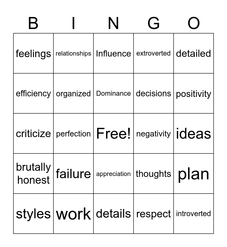This bingo card has a free space and 34 words: Communication, respect, critical, judgement, brutally honest, organized, detailed, styles, relationships, experience, Dominance, Influence, Steadiness, Compliance, negativity, positivity, work, criticize, failure, thoughts, appreciation, feedback, feelings, ideas, details, introverted, extroverted, instinct, decisions, efficiency, rules, perfection, plan and conflict resolution.