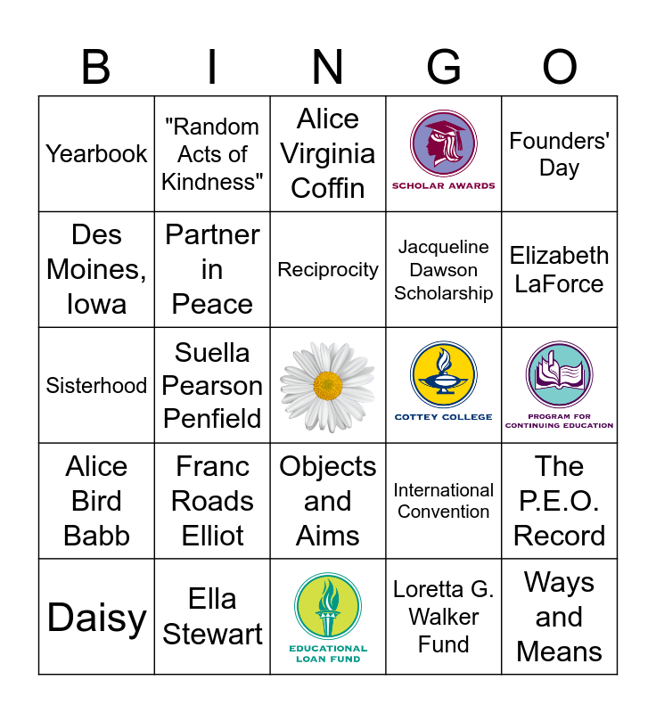 This bingo card has 6 images, a free space and 23 words: Daisy, Suella Pearson Penfield, Yearbook, Alice Virginia Coffin, Partner in Peace, Franc Roads Elliot, Ella Stewart, Ways and Means, Loretta G. Walker Fund, Elizabeth LaForce, Faith McKee, Objects and Aims, Alice Bird Babb, Founders' Day, Sisterhood, International Convention, Mary Allen Stafford, Jacqueline Dawson Scholarship, Des Moines, Iowa, "Random Acts of Kindness", The P.E.O. Record, Reciprocity and "Let's go find the others".