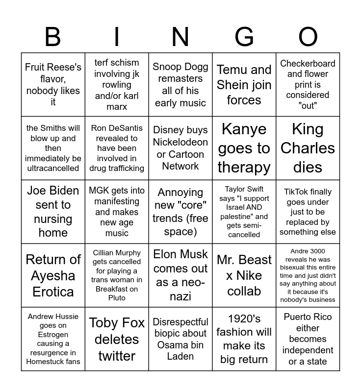 This bingo card has a free space and 24 words: Cillian Murphy gets cancelled for playing a trans woman in Breakfast on Pluto, Toby Fox deletes twitter, Disney buys Nickelodeon or Cartoon Network, Andrew Hussie goes on Estrogen causing a resurgence in Homestuck fans, Checkerboard and flower print is considered "out", Fruit Reese's flavor, nobody likes it, the Smiths will blow up and then immediately be ultracancelled, terf schism involving jk rowling and/or karl marx, Taylor Swift says "I support Israel AND palestine" and gets semi-cancelled, Elon Musk comes out as a neo-nazi, Kanye goes to therapy, Joe Biden sent to nursing home, Mr. Beast x Nike collab, Andre 3000 reveals he was bisexual this entire time and just didn't say anything about it because it's nobody's business, Ron DeSantis revealed to have been involved in drug trafficking, 1920's fashion will make its big return, TikTok finally goes under just to be replaced by something else, Snoop Dogg remasters all of his early music, King Charles dies, MGK gets into manifesting and makes new age music, Puerto Rico either becomes independent or a state, Return of Ayesha Erotica, Temu and Shein join forces and Disrespectful biopic about Osama bin Laden.