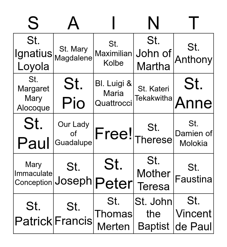 This bingo card has a free space and 24 words: St. Joseph, St. Francis, Bl. Luigi & Maria Quattrocci, St. Patrick, St. Anthony, St. Ignatius Loyola, St. Margaret Mary Alocoque, St. Mary Magdalene, St. Therese, St. Peter, St. Kateri Tekakwitha, St. Paul, St. Mother Teresa, St. Faustina, St. Pio, St. John the Baptist, St. Damien of Molokia, St. Maximilian Kolbe, St. Anne, Our Lady of Guadalupe, St. Vincent de Paul, Mary Immaculate Conception, St. John of Martha and St. Thomas Merten.