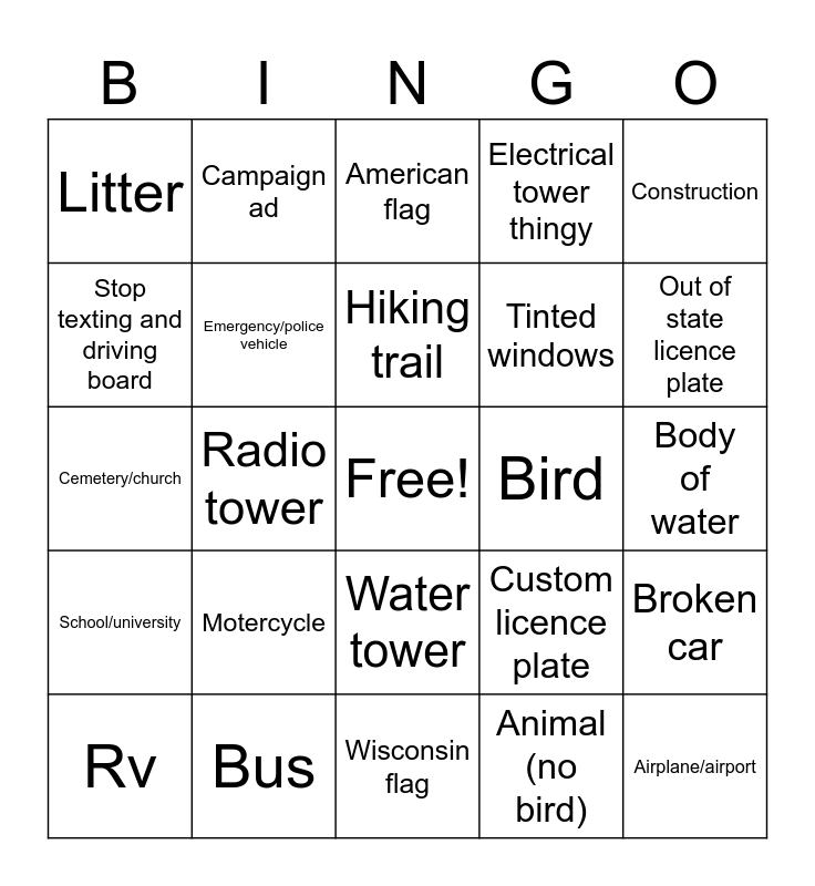 This bingo card has a free space and 24 words: Motercycle, Bus, Hiking trail, Rv, Construction, Litter, Stop texting and driving board, Campaign ad, Bird, Water tower, Tinted windows, Cemetery/church, Custom licence plate, Broken car, Emergency/police vehicle, Animal (no bird), Body of water, American flag, Out of state licence plate, Radio tower, Airplane/airport, School/university, Electrical tower thingy and Wisconsin flag.