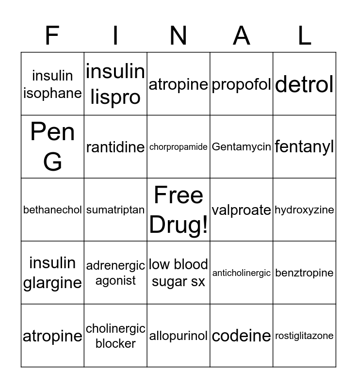This bingo card has a free space and 24 words: adrenergic agonist, cholinergic blocker, chorpropamide, atropine, detrol, insulin isophane, Pen G, insulin lispro, valproate, low blood sugar sx, Gentamycin, bethanechol, anticholinergic, benztropine, rantidine, codeine, hydroxyzine, atropine, fentanyl, sumatriptan, rostiglitazone, insulin glargine, propofol and allopurinol.