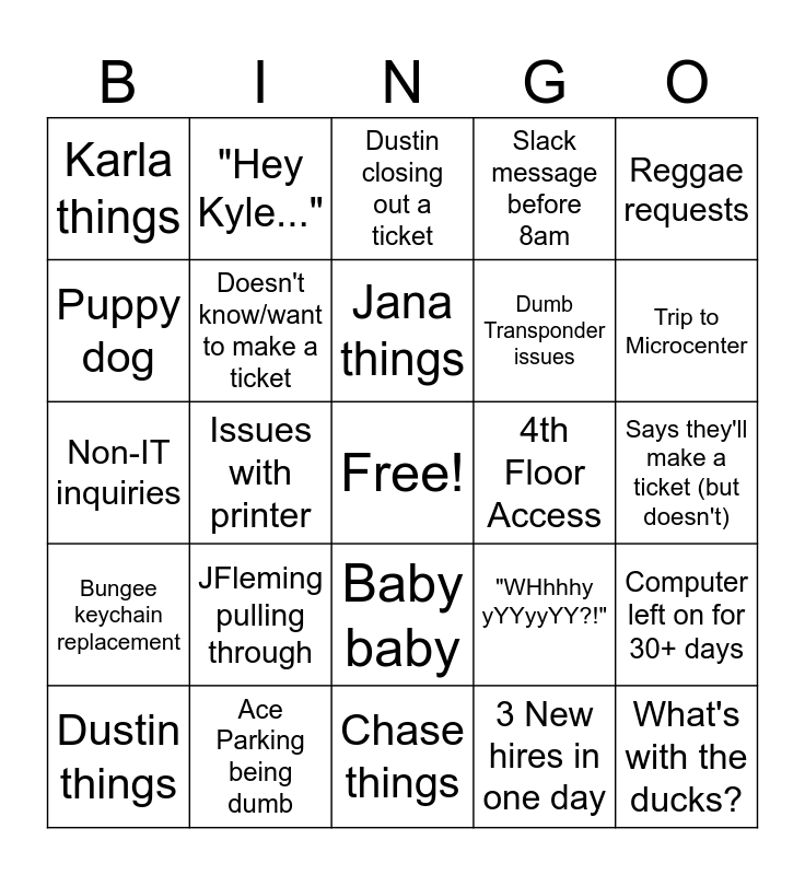 This bingo card has a free space and 24 words: JFleming pulling through, Ace Parking being dumb, Jana things, Dustin things, Reggae requests, Karla things, Puppy dog, "Hey Kyle...", 4th Floor Access, Baby baby, Dumb Transponder issues, Non-IT inquiries, "WHhhhy yYYyyYY?!", Computer left on for 30+ days, Doesn't know/want to make a ticket, 3 New hires in one day, Says they'll make a ticket (but doesn't), Dustin closing out a ticket, Trip to Microcenter, Issues with printer, What's with the ducks?, Bungee keychain replacement, Slack message before 8am and Chase things.