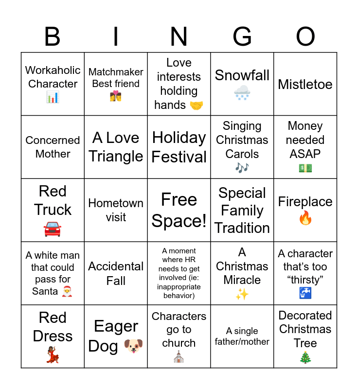 This bingo card has a free space and 24 words: Accidental Fall, Eager Dog πΆ, Holiday Festival, Red DressππΎ, Mistletoe, Workaholic Character π, Concerned Mother, Matchmaker Best friend π©ββ€οΈβπβπ¨, Special Family Tradition, A moment where HR needs to get involved (ie: inappropriate behavior), Singing Christmas Carols πΆ, Red Truck π, A Christmas Miracle β¨, A character thatβs too βthirstyβ π°, A Love Triangle, A single father/mother, Fireplace π₯, Love interests holding hands π€, Money needed ASAP π΅, Hometown visit, Decorated Christmas Tree π, A white man that could pass for Santa π , Snowfall π¨οΈ and Characters go to church βͺοΈ.
