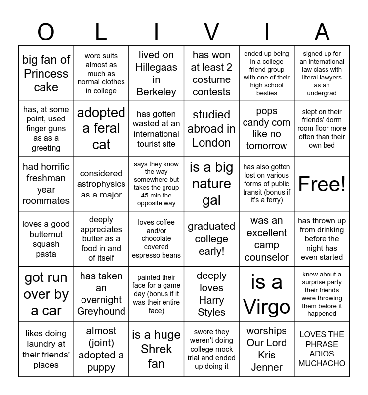 This bingo card has 37 words: is a Virgo, deeply loves Harry Styles, worships Our Lord Kris Jenner, has, at some point, used finger guns as as a greeting, deeply appreciates butter as a food in and of itself, has also gotten lost on various forms of public transit (bonus if it's a ferry), adopted a feral cat, swore they weren't doing college mock trial and ended up doing it, ended up being in a college friend group with one of their high school besties, likes doing laundry at their friends' places, slept on their friends' dorm room floor more often than their own bed, has won at least 2 costume contests, had horrific freshman year roommates, says they know the way somewhere but takes the group 45 min the opposite way, signed up for an international law class with literal lawyers as an undergrad, is a big nature gal, has taken an overnight Greyhound, lived on Hillegaas in Berkeley, Free!, considered astrophysics as a major, big fan of Princess cake, studied abroad in London, loves coffee and/or chocolate covered espresso beans, was an excellent camp counselor, almost (joint) adopted a puppy, has thrown up from drinking before the night has even started, wore suits almost as much as normal clothes in college, is a huge Shrek fan, knew about a surprise party their friends were throwing them before it happened, painted their face for a game day (bonus if it was their entire face), has been to multiple sorority date parties without ever being in a sorority, graduated college early!, pops candy corn like no tomorrow, got run over by a car, loves a good butternut squash pasta, has gotten wasted at an international tourist site and LOVES THE PHRASE ADIOS MUCHACHO.